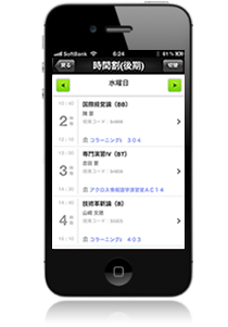 ◎ 時間割・チャンネル 自分が受けている講義の講義時間、講義室、担当教員、授業コードをチェックすることはもちろん、その授業の評価基準や講義スケジュールなどの詳しいシラバス情報も素早く調べられます。